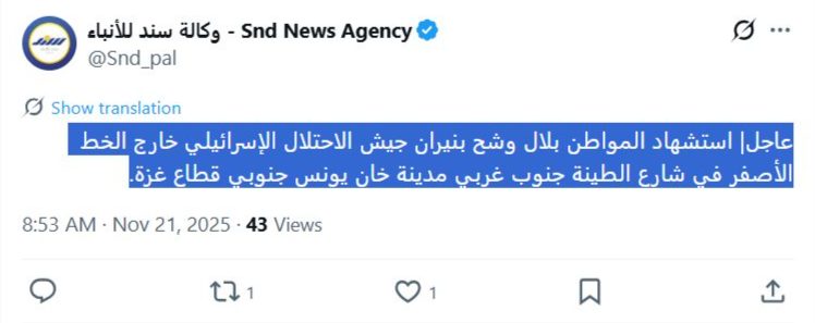 Urgent | Citizen Bilal Washah was martyred by Israeli occupation army fire outside the yellow line in Al-Tina Street, southwest of Khan Yunis city, southern Gaza Strip.