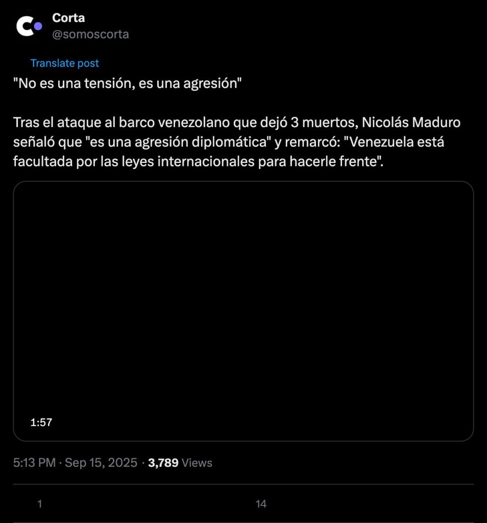 Following the attack on the Venezuelan ship that left three dead, Nicolás Maduro stated that "it's a diplomatic aggression" and emphasized: "Venezuela is empowered by international law to confront it."