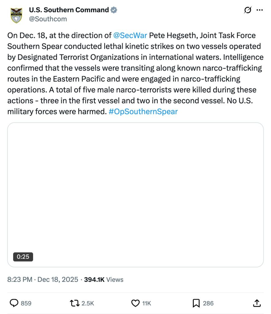 On Dec. 18, at the direction of @SecWar Pete Hegseth, Joint Task Force Southern Spear conducted lethal kinetic strikes on two vessels operated by Designated Terrorist Organizations in international waters. Intelligence confirmed that the vessels were transiting along known narco-trafficking routes in the Eastern Pacific and were engaged in narco-trafficking operations. A total of five male narco-terrorists were killed during these actions - three in the first vessel and two in the second vessel. No U.S. military forces were harmed. #OpSouthernSpear