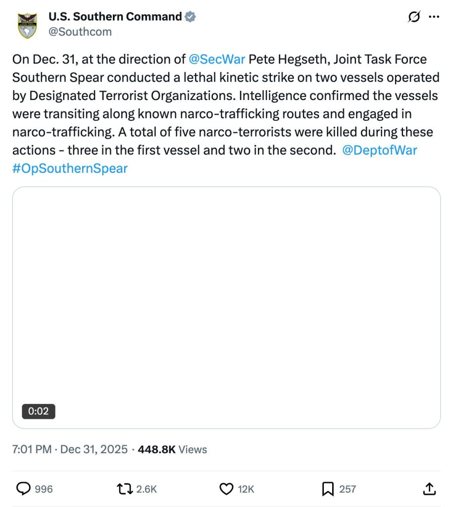 On Dec. 31, at the direction of @SecWar Pete Hegseth, Joint Task Force Southern Spear conducted a lethal kinetic strike on two vessels operated by Designated Terrorist Organizations. Intelligence confirmed the vessels were transiting along known narco-trafficking routes and engaged in narco-trafficking. A total of five narco-terrorists were killed during these actions - three in the first vessel and two in the second. @DeptofWar #OpSouthernSpear