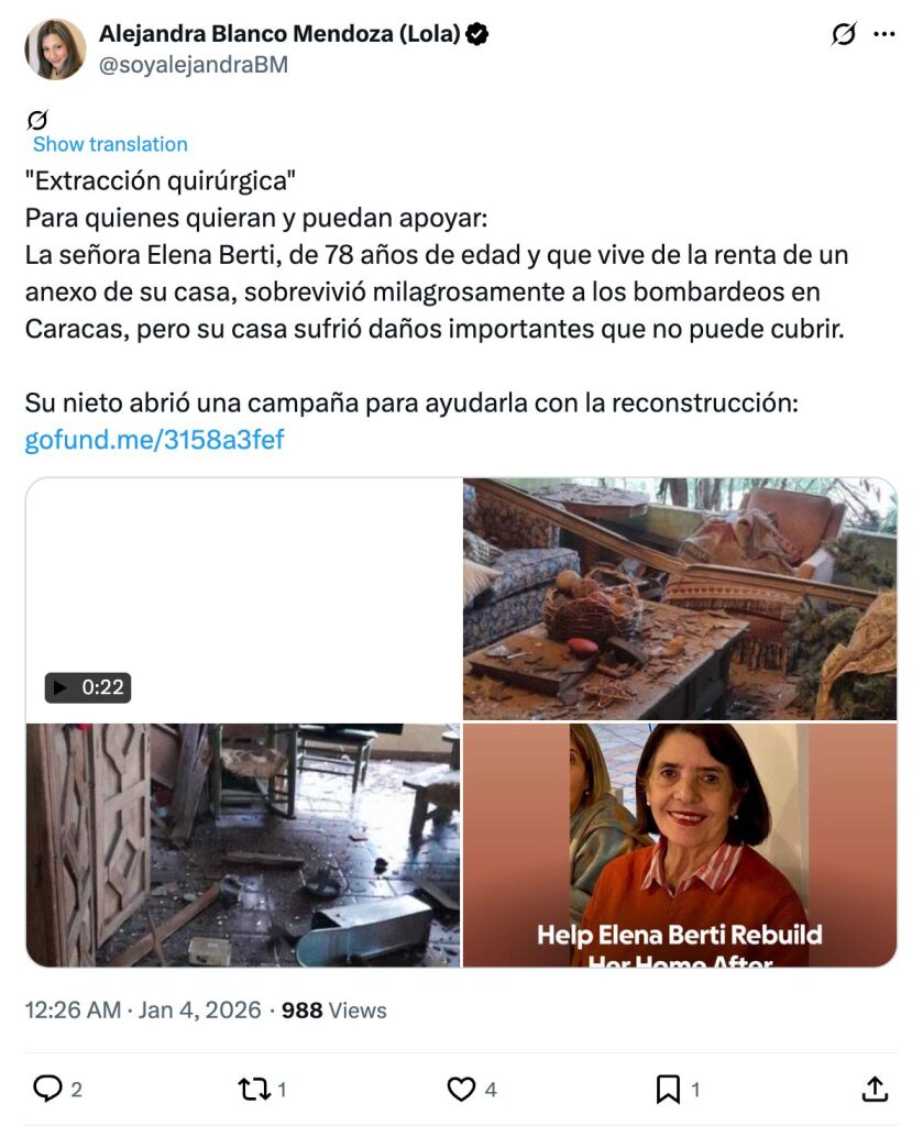 For those who wish and are able to help: Mrs. Elena Berti, 78 years old, who lives off the rent from an annex to her house, miraculously survived the bombings in Caracas, but her house suffered significant damage that she cannot afford to repair.