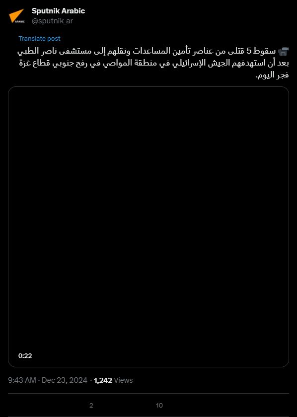 Five aid workers were killed and taken to Nasser Hospital after being targeted by the Israeli army in the Al-Mawasi area of Rafah, south of the Gaza Strip, early this morning.