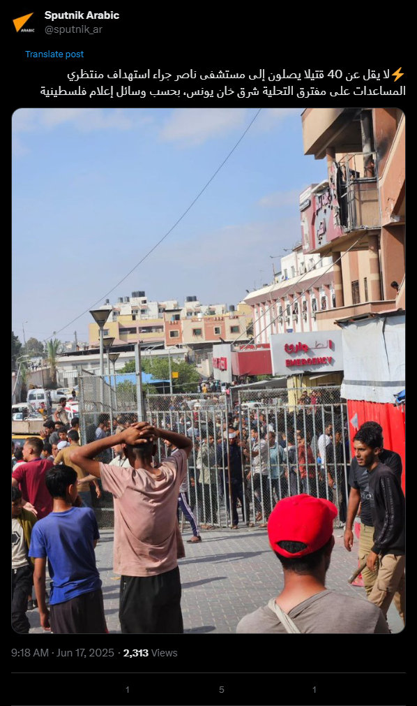 لا يقل عن 40 قتيلا يصلون إلى مستشفى ناصر جراء استهداف منتظري المساعدات على مفترق التحلية شرق خان يونس، بحسب وسائل إعلام فلسطينية