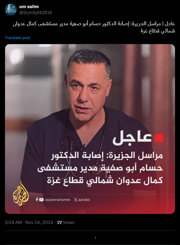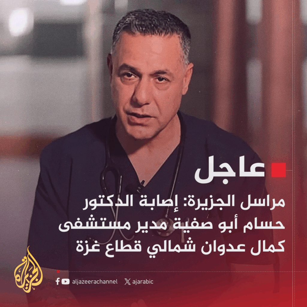 Urgent | Al Jazeera correspondent: Dr. Hussam Abu Safiya, director of Kamal Adwan Hospital in the northern Gaza Strip, was injured.