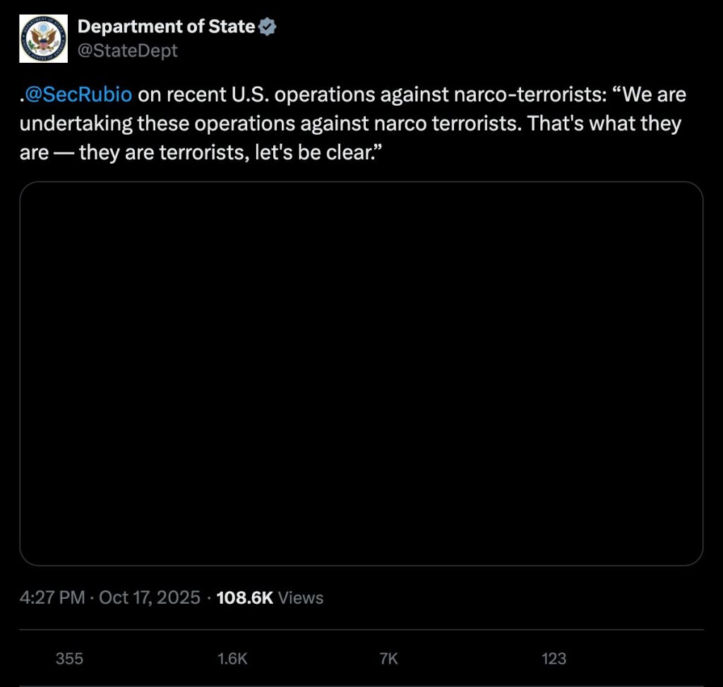 .@SecRubio on recent U.S. operations against narco-terrorists: “We are undertaking these operations against narco terrorists. That's what they are — they are terrorists, let's be clear.”