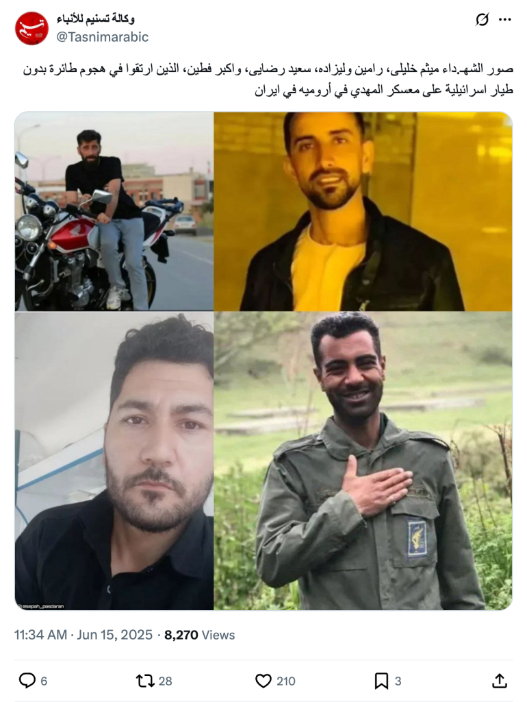 صور الشهـ.داء میثم خلیلی، رامین ولیزاده، سعید رضایی، واکبر فطین، الذين ارتقوا في هجوم طائرة بدون طيار اسرائيلية على معسكر المهدي في أروميه في ايران