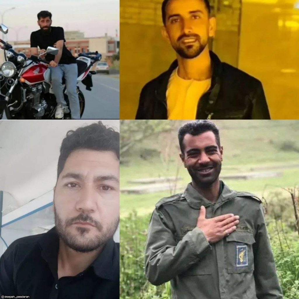 Photos of the martyrs Meysam Khalili, Ramin Valizadeh, Saeed Rezaei, and Akbar Fatin, who were killed in an Israeli drone attack on the Mahdi camp in Urmia, Iran.