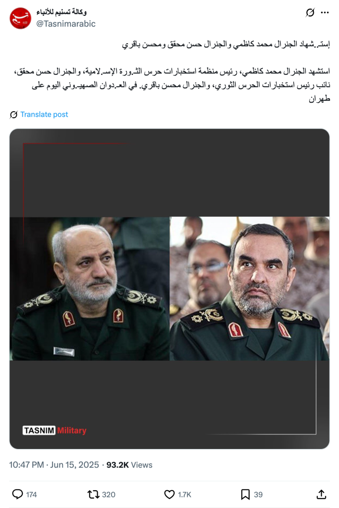 استشهد الجنرال محمد كاظمي، رئيس منظمة استخبارات حرس الثـ.ورة الإسـ.لامية، والجنرال حسن محقق، نائب رئيس استخبارات الحرس الثوري، والجنرال محسن باقري. في العـ.دوان الصهيـ.وني اليوم على طهران