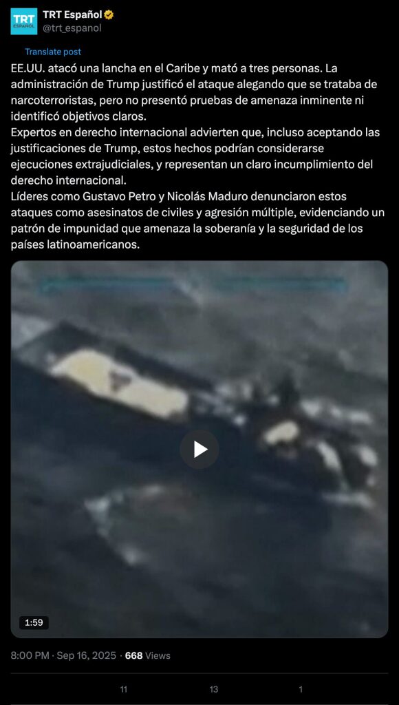 Expertos en derecho internacional advierten que, incluso aceptando las justificaciones de Trump, estos hechos podrían considerarse ejecuciones extrajudiciales, y representan un claro incumplimiento del derecho internacional.