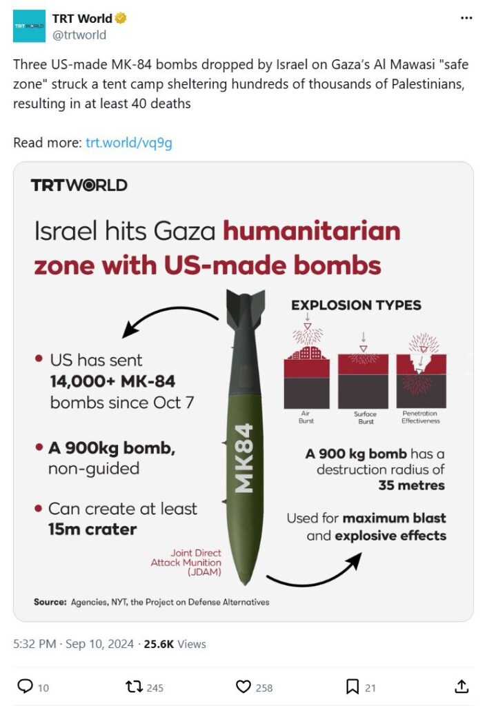 Three US-made MK-84 bombs dropped by Israel on Gaza’s Al Mawasi "safe zone" struck a tent camp sheltering hundreds of thousands of Palestinians, resulting in at least 40 deaths