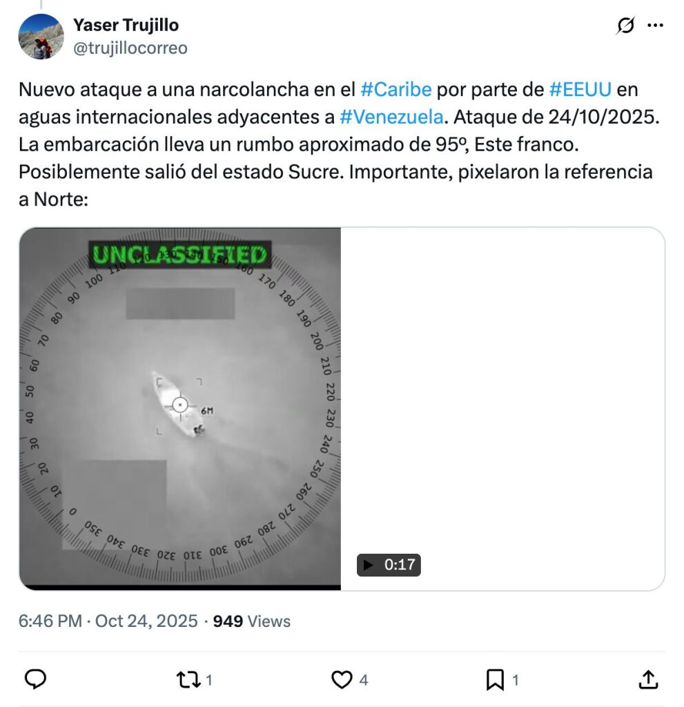 Nuevo ataque a una narcolancha en el #Caribe por parte de #EEUU en aguas internacionales adyacentes a #Venezuela. Ataque de 24/10/2025. La embarcación lleva un rumbo aproximado de 95º, Este franco. Posiblemente salió del estado Sucre. Importante, pixelaron la referencia a Norte: