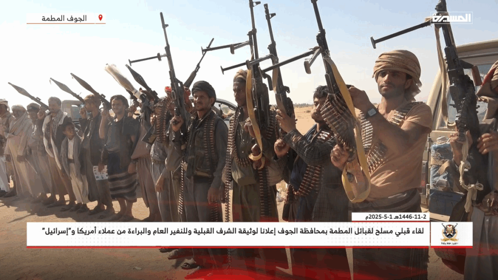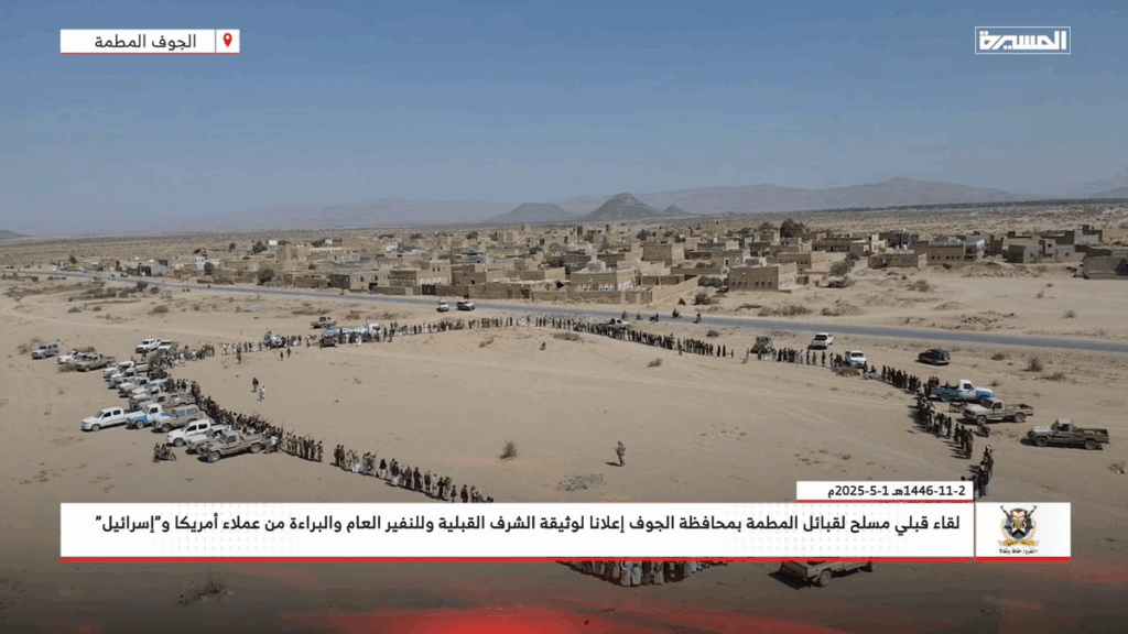 In pictures | An armed tribal meeting of the #Al-Matmah tribes in #Al-Jawf Governorate, announcing the tribal honor document, the general mobilization, and disavowal of the agents of America and "Israel." #Escalation_for_Escalation #We_Will_Not_Leave_Gaza
