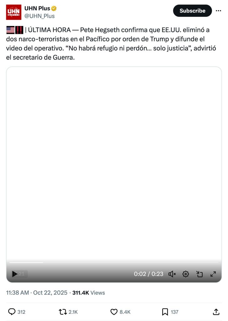 | ÚLTIMA HORA — Pete Hegseth confirma que EE.UU. eliminó a dos narco-terroristas en el Pacífico por orden de Trump y difunde el video del operativo. “No habrá refugio ni perdón… solo justicia”, advirtió el secretario de Guerra.