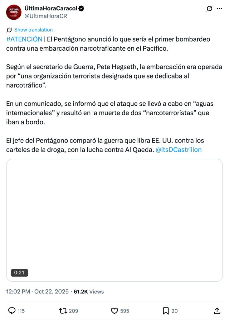 #ATENCIÓN | El Pentágono anunció lo que sería el primer bombardeo contra una embarcación narcotraficante en el Pacífico.