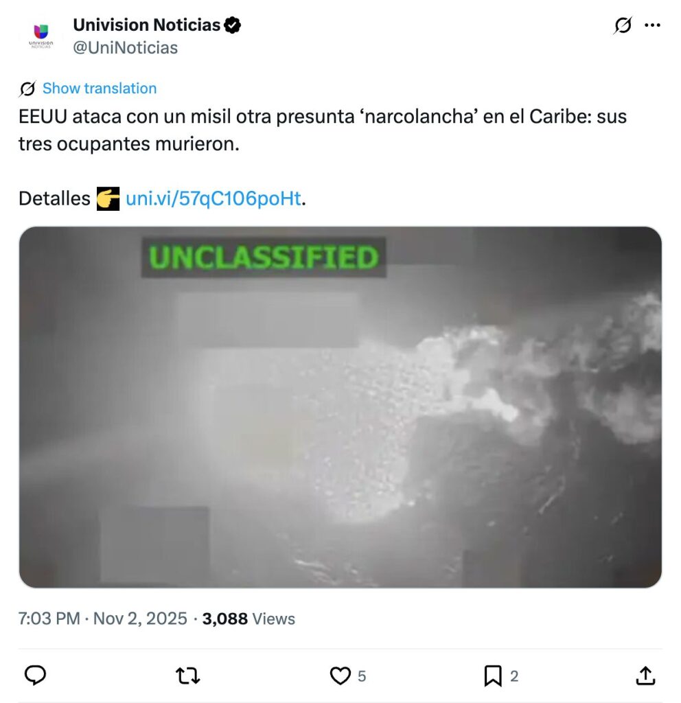 EEUU ataca con un misil otra presunta ‘narcolancha’ en el Caribe: sus tres ocupantes murieron.