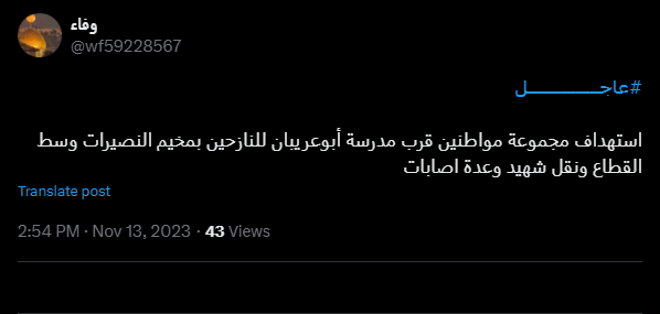 #Urgent: A group of citizens was targeted near Abu Oraiban School for the displaced in Al-Nuseirat camp in the central Gaza Strip. One martyr and several others were injured.