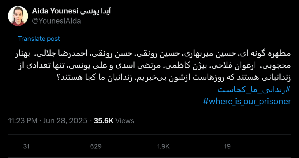 Motaharah Gunaei, Hossein Mirbahari, Hossein Ronaghi, Hassan Ronaghi, Ahmadreza Jalali, Behnaz Mahjoubi, Arghavan Fallahi, Bijan Kazemi, Morteza Asadi, and Ali Younesi are just a few of the prisoners we have not heard from for days. Where are our prisoners? #Where_is_our_prisoner
