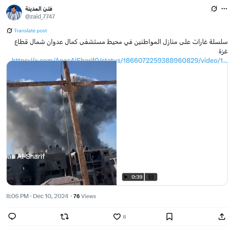 سلسلة غارات على منازل المواطنين في محيط مستشفى كمال عدوان شمال قطاع غزة https://x.com/AnasAlSharif0/status/1866072259388960829/video/1…