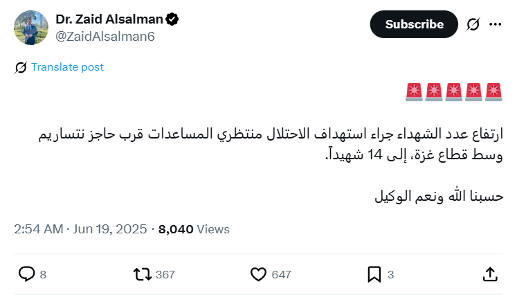 The death toll from the Israeli attack on aid workers near the Netzarim checkpoint in the central Gaza Strip has risen to 14. God is sufficient for us, and He is the best Disposer of affairs.