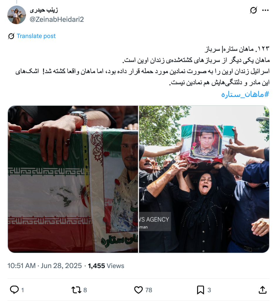 اسرائیل زندان اوین را به صورت نمادین مورد حمله قرار داده بود، اما ماهان واقعا کشته شد! اشک‌های این مادر و دلتنگی‌هایش هم نمادین نیست.