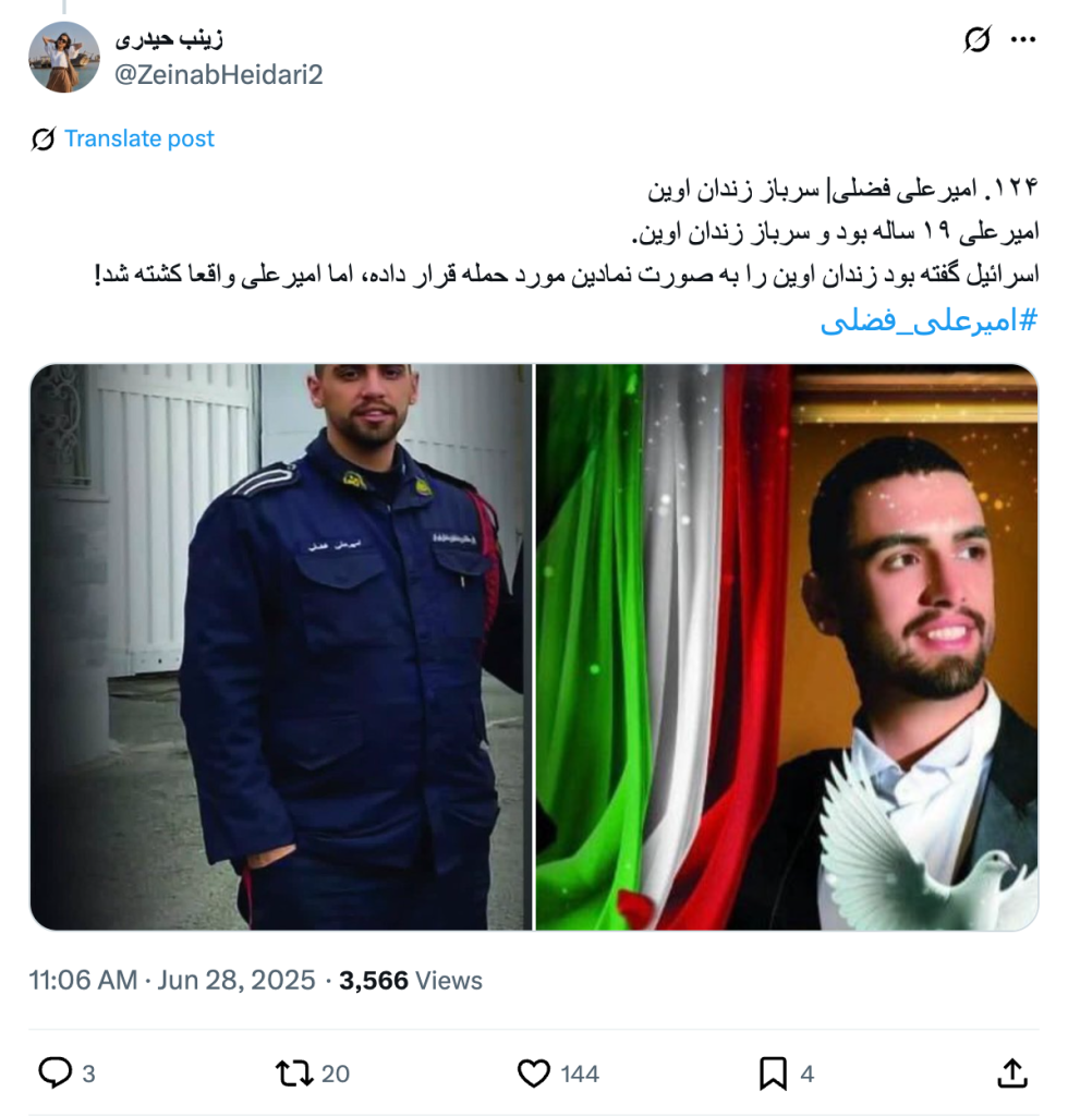 124. Amir Ali Fazli | Evin Prison Soldier Amir Ali was 19 years old and a soldier in Evin Prison. Israel had said it had symbolically attacked Evin Prison, but Amir Ali was actually killed! #AmirAli_Fazli