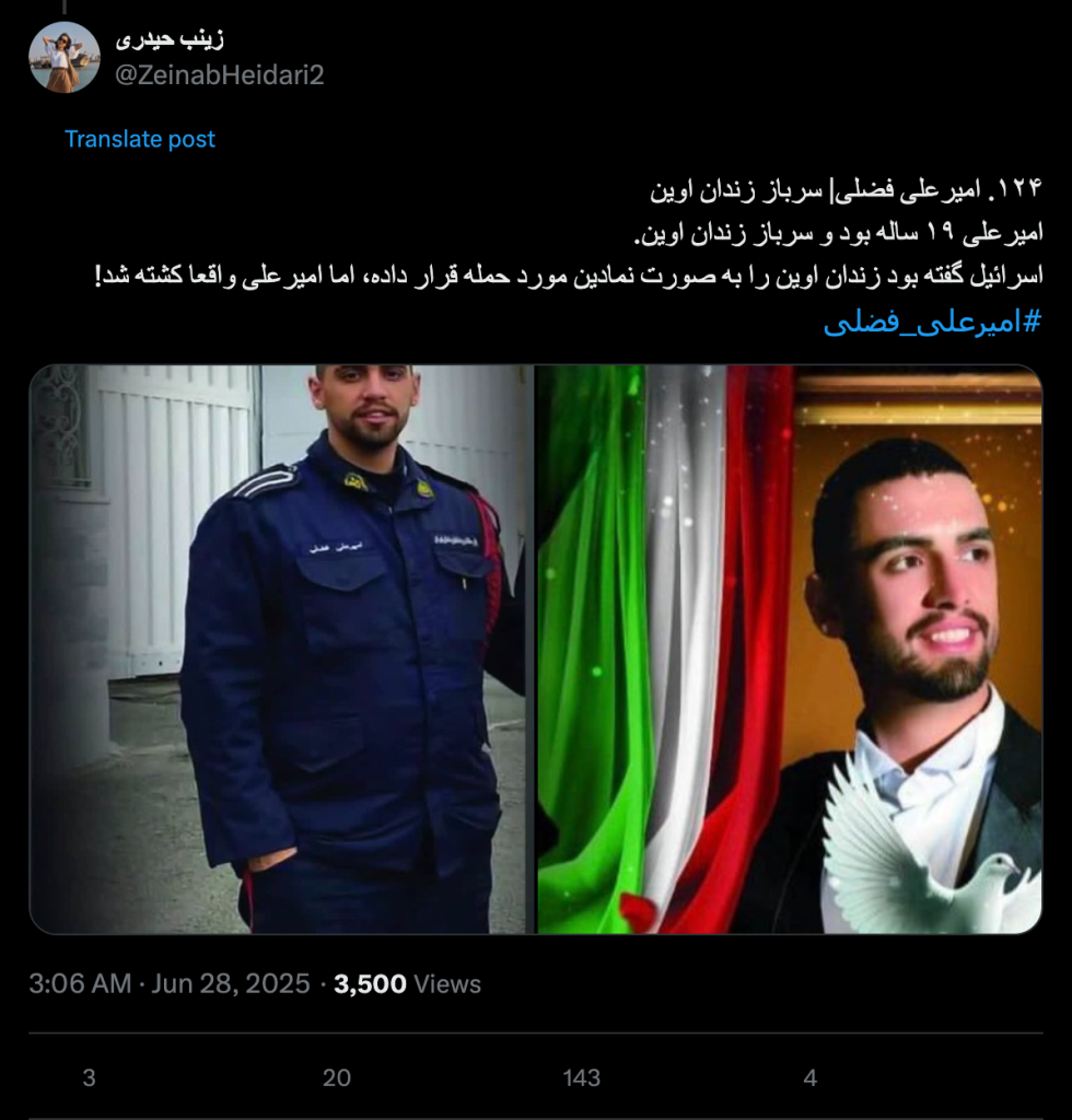 124. Amir Ali Fazli | Evin Prison Soldier Amir Ali was 19 years old and a soldier in Evin Prison. Israel had said it had symbolically attacked Evin Prison, but Amir Ali was actually killed! #AmirAli_Fazli