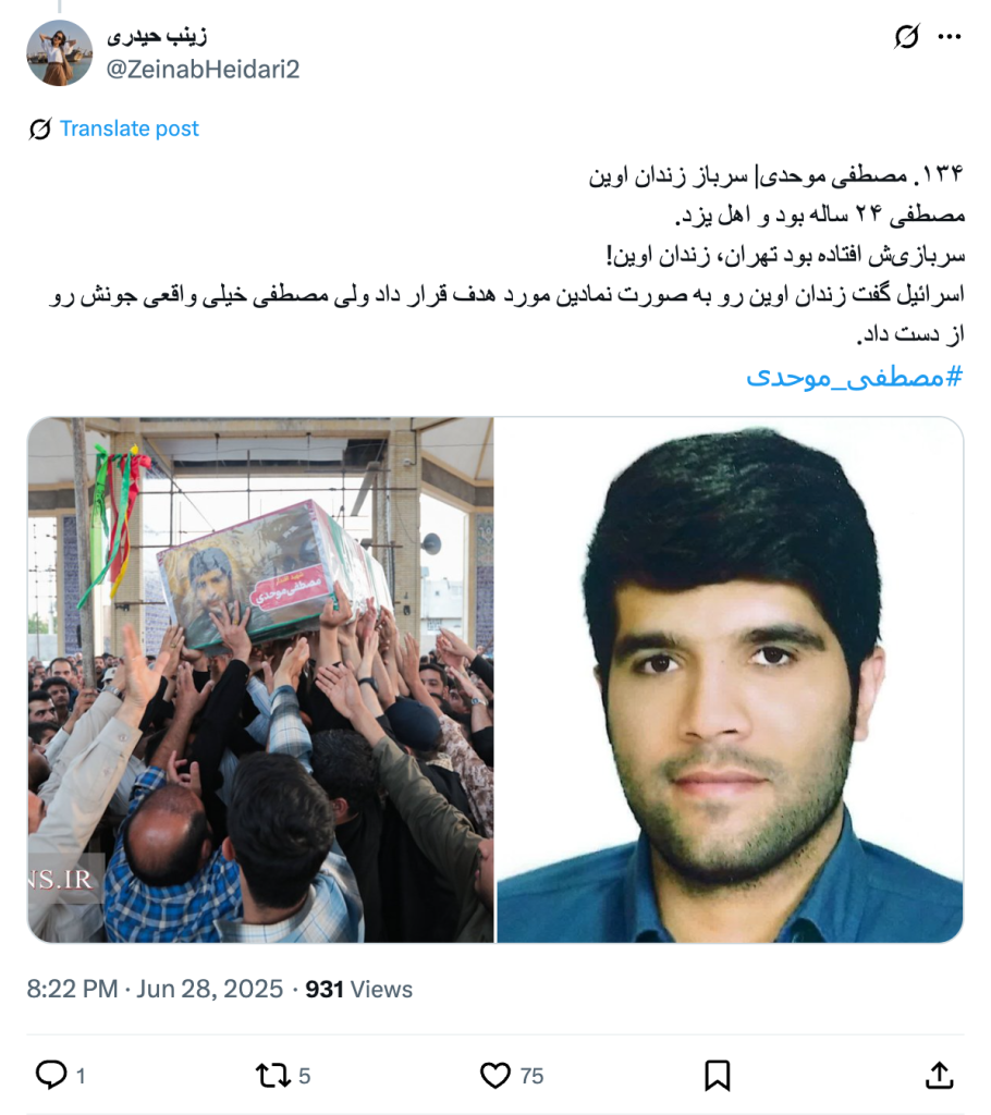 134. Mustafa Movahedi | Evin Prison Soldier Mustafa was 24 years old and from Yazd. His military service landed him in Tehran, Evin Prison! Israel said it targeted Evin Prison symbolically, but Mustafa really lost his life. #Mustafa_Movahedi