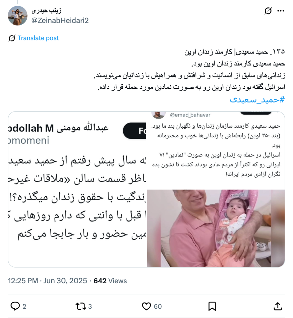 135. Hamid Saeedi | Evin Prison Employee Hamid Saeedi was an employee of Evin Prison. Former prisoners write about his humanity and honor and his companionship with prisoners. Israel had said that it had symbolically attacked Evin Prison. #Hamid_Saeedi