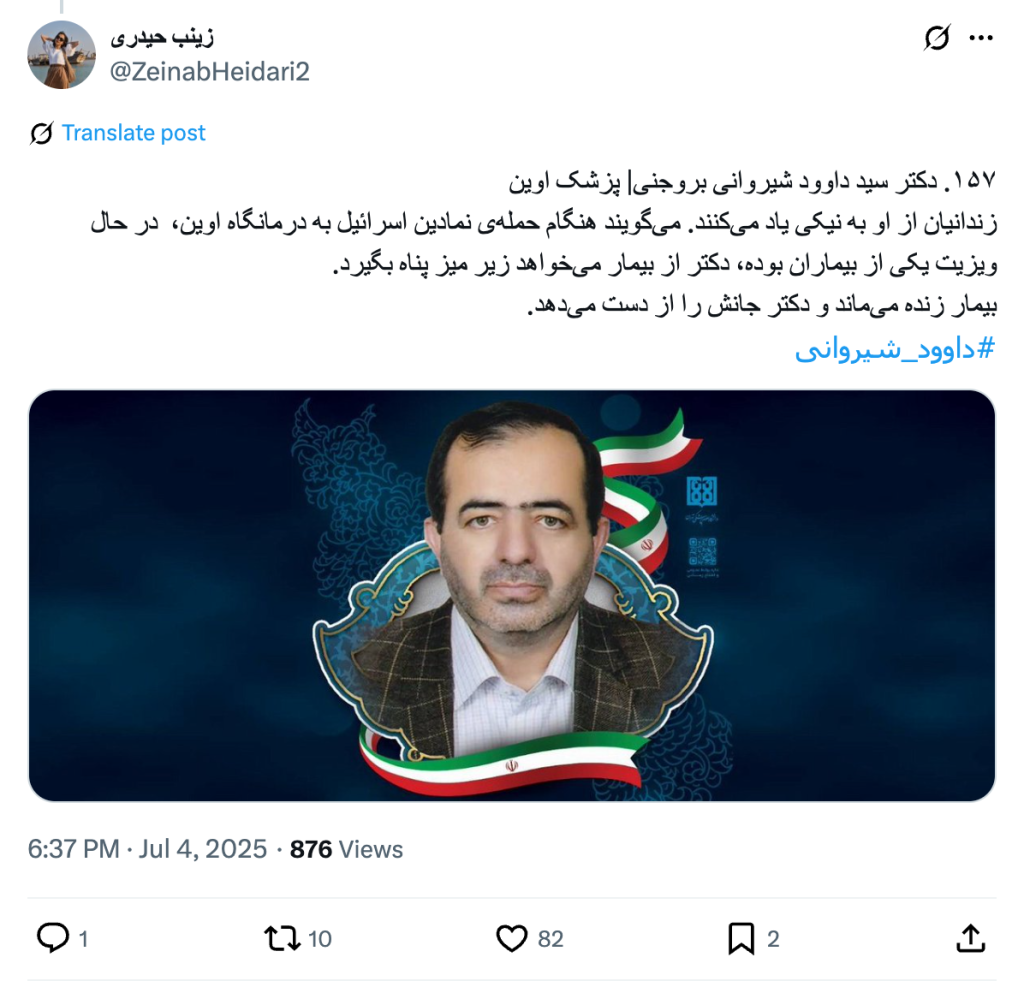 157. Dr. Seyed Davoud Shirvani Borujeni | Evin Prison doctor. Prisoners remember him fondly. They say that during the symbolic Israeli attack on Evin Clinic, he was visiting a patient. The doctor asked the patient to take shelter under the table. The patient survived and the doctor lost his life. #Davoud_Shirvani