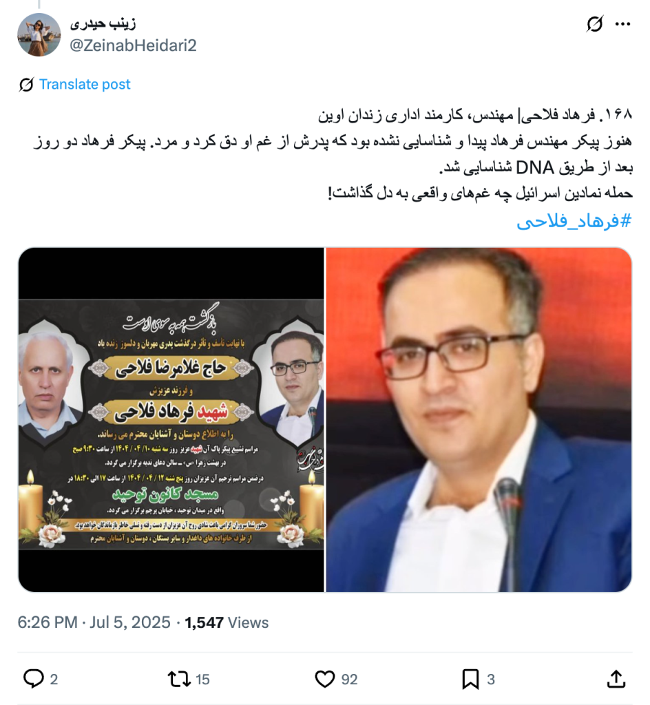 168. Farhad Fallahi | Engineer, administrative employee of Evin Prison Engineer Farhad's body had not yet been found and identified when his father collapsed and died of grief. Farhad's body was identified two days later through DNA. What real sorrows the symbolic Israeli attack brought to the heart! #Farhad_Falahi