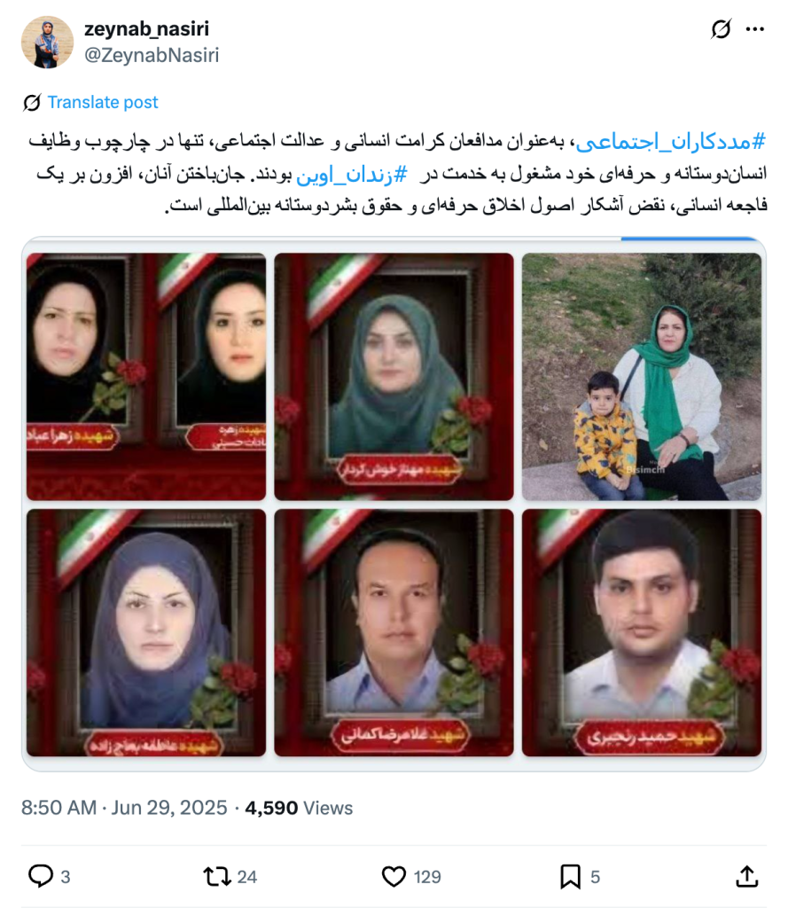 #Social_workers, as defenders of human dignity and social justice, were serving in #Evin_Prison only within the framework of their humanitarian and professional duties. Their deaths, in addition to being a humanitarian tragedy, are a clear violation of the principles of professional ethics and international humanitarian law.