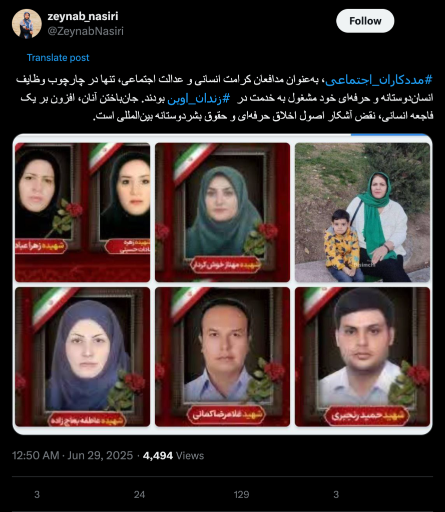 #Social_aiders, as defenders of human dignity and social justice, were serving in #Evin_Prison only within the framework of their humanitarian and professional duties. Their deaths, in addition to being a humanitarian tragedy, are a clear violation of the principles of professional ethics and international humanitarian law.
